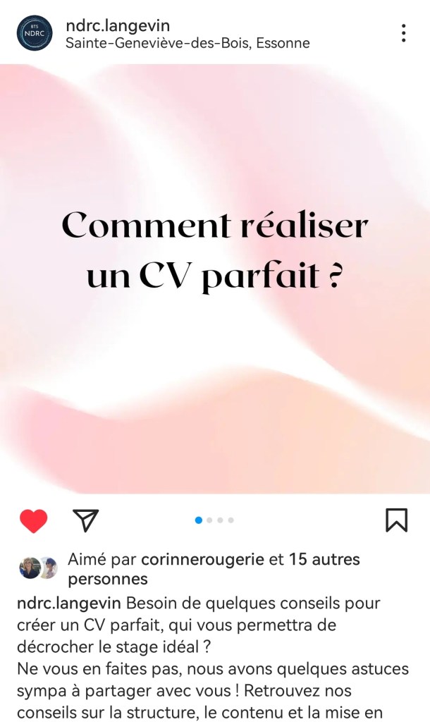 Nous avons réalisé des publications comme par exemple pour le compte Instagram du BTS, où nous expliquions comment réaliser un CV, pour aider d’autres étudiants, ou comment trouver un stage. Nous avons également présenté notre page Linkedin,